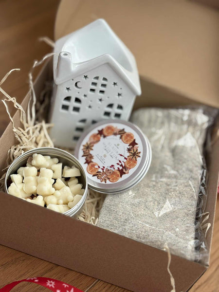 PRESENTS INCLUDE: 1x WHITE HOUSE, 1x WAX MELTS - little sweet bears Candy Cane, 1x Wool Socks Fuzzy Beige or Rose, 1x present box