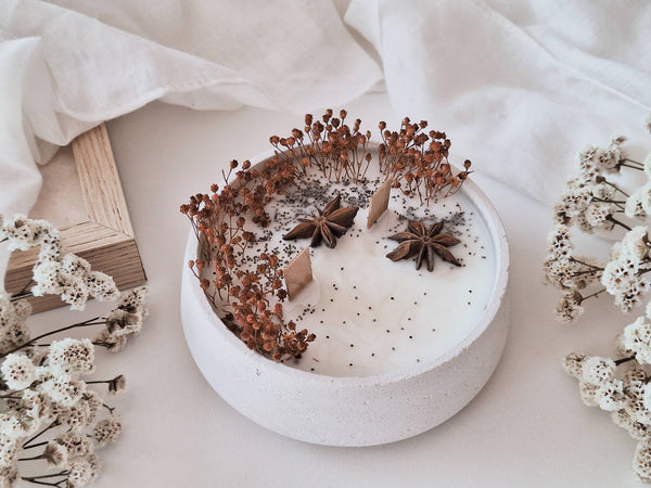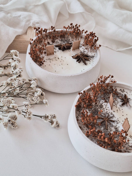Discover our "Sweater Weather" floral soy candle in a cement jar (handcrafted and hand-polished), made with eco-friendly soy wax, a wooden wick, without dyes or artificial fragrances, and of course, without any animal-derived ingredients... and it doesn't release toxins when lit.
